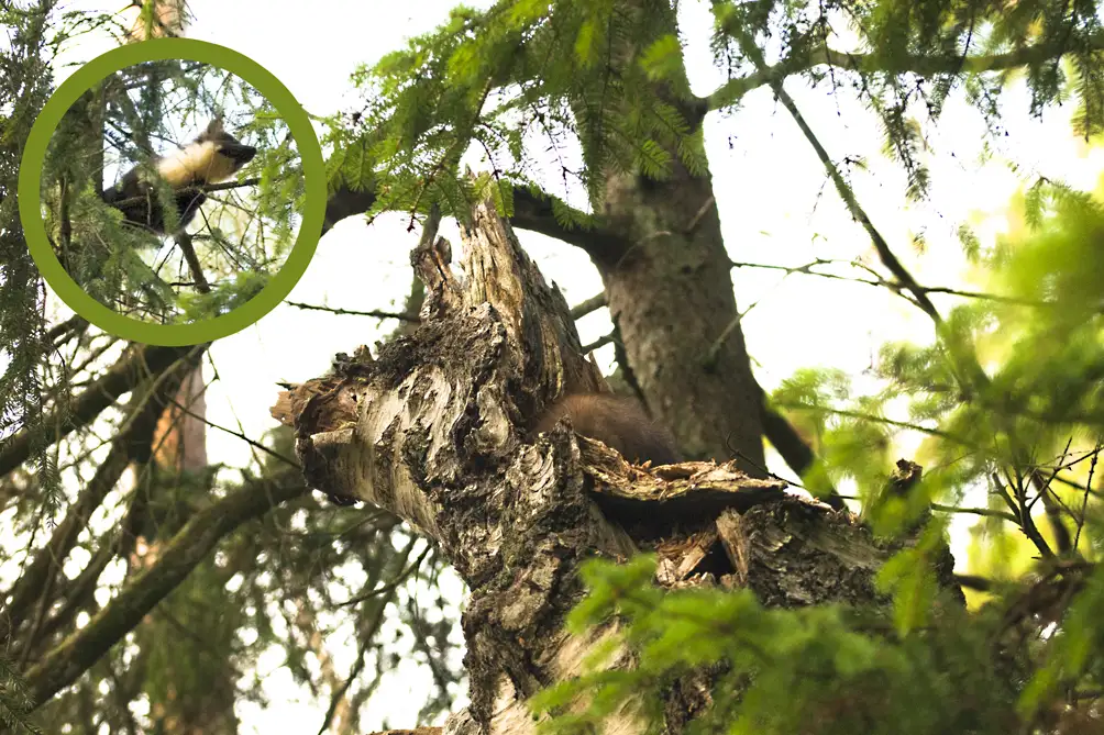 Ein seltener Baummarder (Martes martes) schaute noch ein letztes Mal in die Linse meines Objektives und verschwand dann mit einem weiten Sprung in den unübersichtlichen Baumkronen. Diese gut getarnten Tiere hatten wir noch nie in freier Wildbahn erleben dürfen. Einerseits war es ein beeindruckendes Erlebnis, andererseits tat es uns leid, dass wir den Schlaf des nachtaktiven Jägers so unsanft unterbrochen hatten.