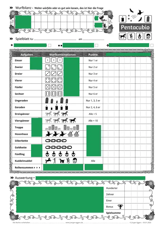 Während man Kniffel schnell herunterwürfelt und seine Punkte auf einem kleinen Zettel im Stile eines Quittungsblocks schreibt, verlangt Pentacubio mehr Überlegung und erfreut das Auge mit einem schmucken Spielblatt im großzügigen DIN-A4-Format.